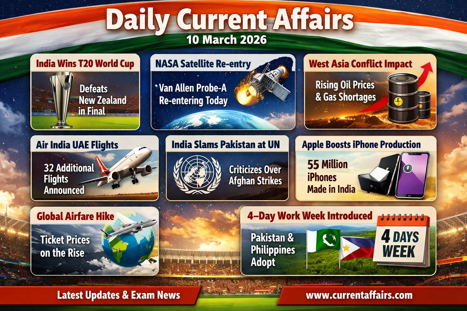 1. India Wins ICC Men’s T20 World Cup 2026 2. NASA Satellite Re-entry Alert 3. Impact of West Asia Conflict on India 4. Air India Announces Additional UAE Flights 5. India Criticizes Pakistan at the United Nations 6. Apple Expands iPhone Production in India 7. Global Airline Ticket Prices Rising 8. Four-Day Work Week Introduced … Read more